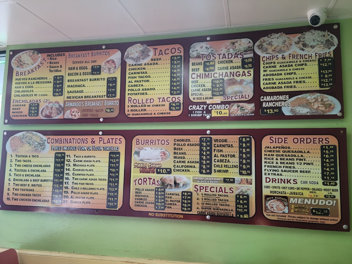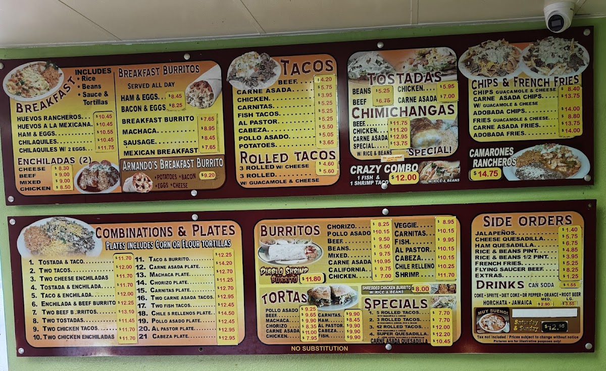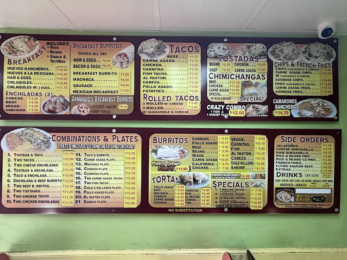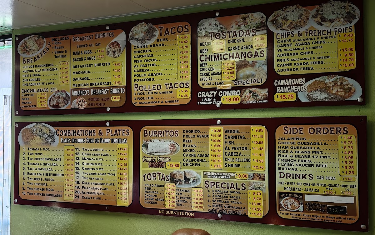 Armando's offers a tantalizing selection of dishes that truly highlight the richness of Mexican flavors. The menu features mouth-watering breakfast burritos, including must-tries like the Ham & Eggs and the famous Machaca, which packs a hearty punch of flavor for just $9.95. For lunch or a late-night snack, their burritos come in various tantalizing options, including Chorizo, Pollo Asado, and Carnitas, all perfectly wrapped for a satisfying meal. At prices starting as low as $5.50 for the Bean burrito, you can indulge in hearty portions without breaking the bank.