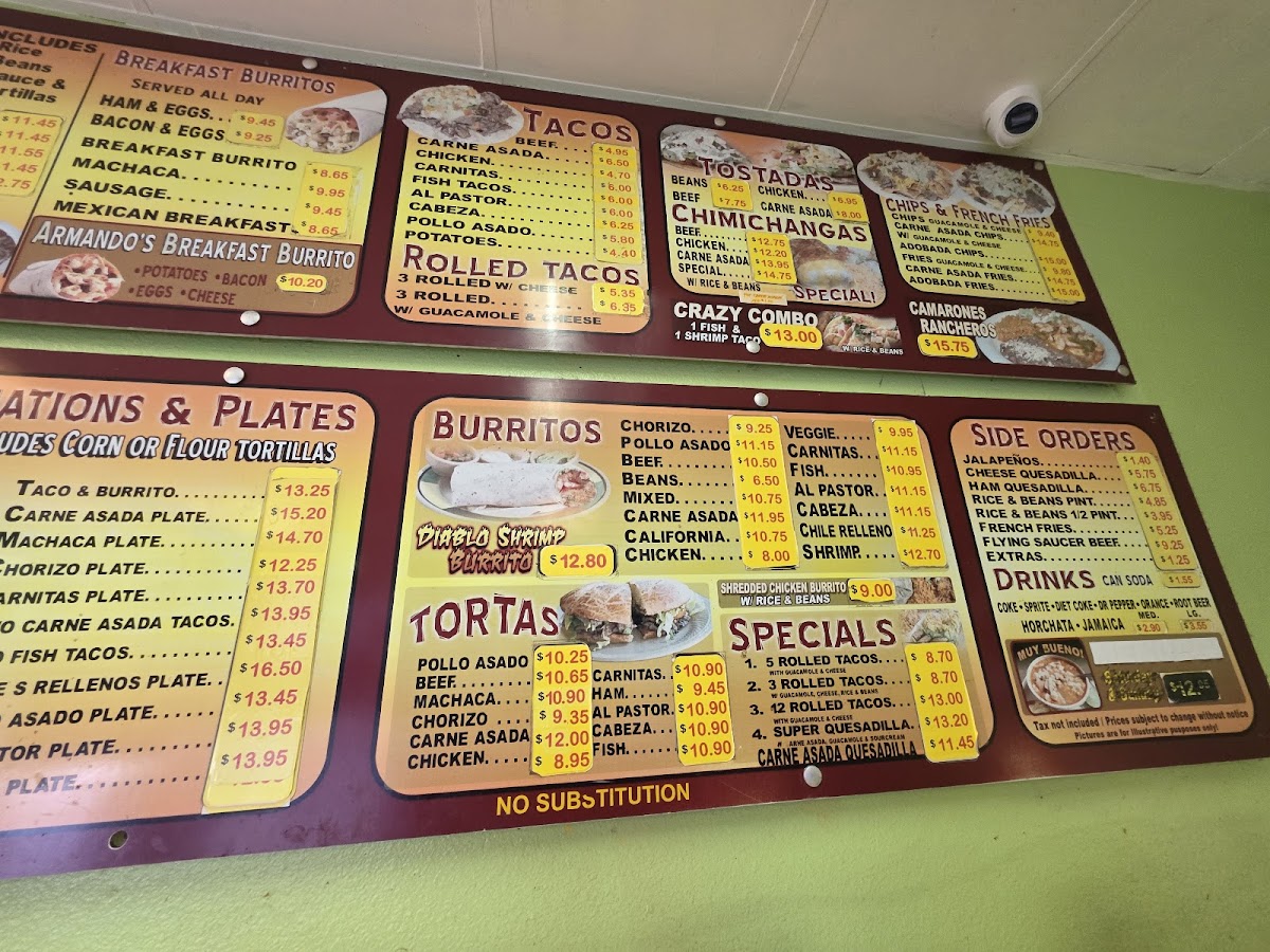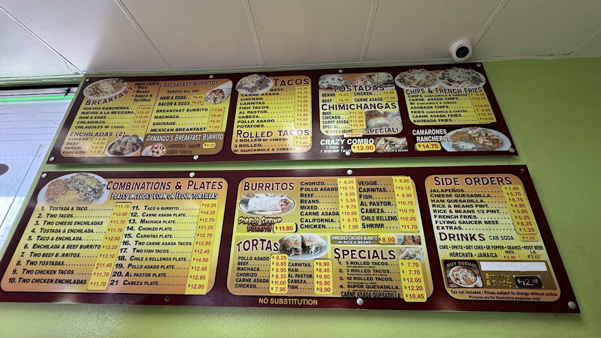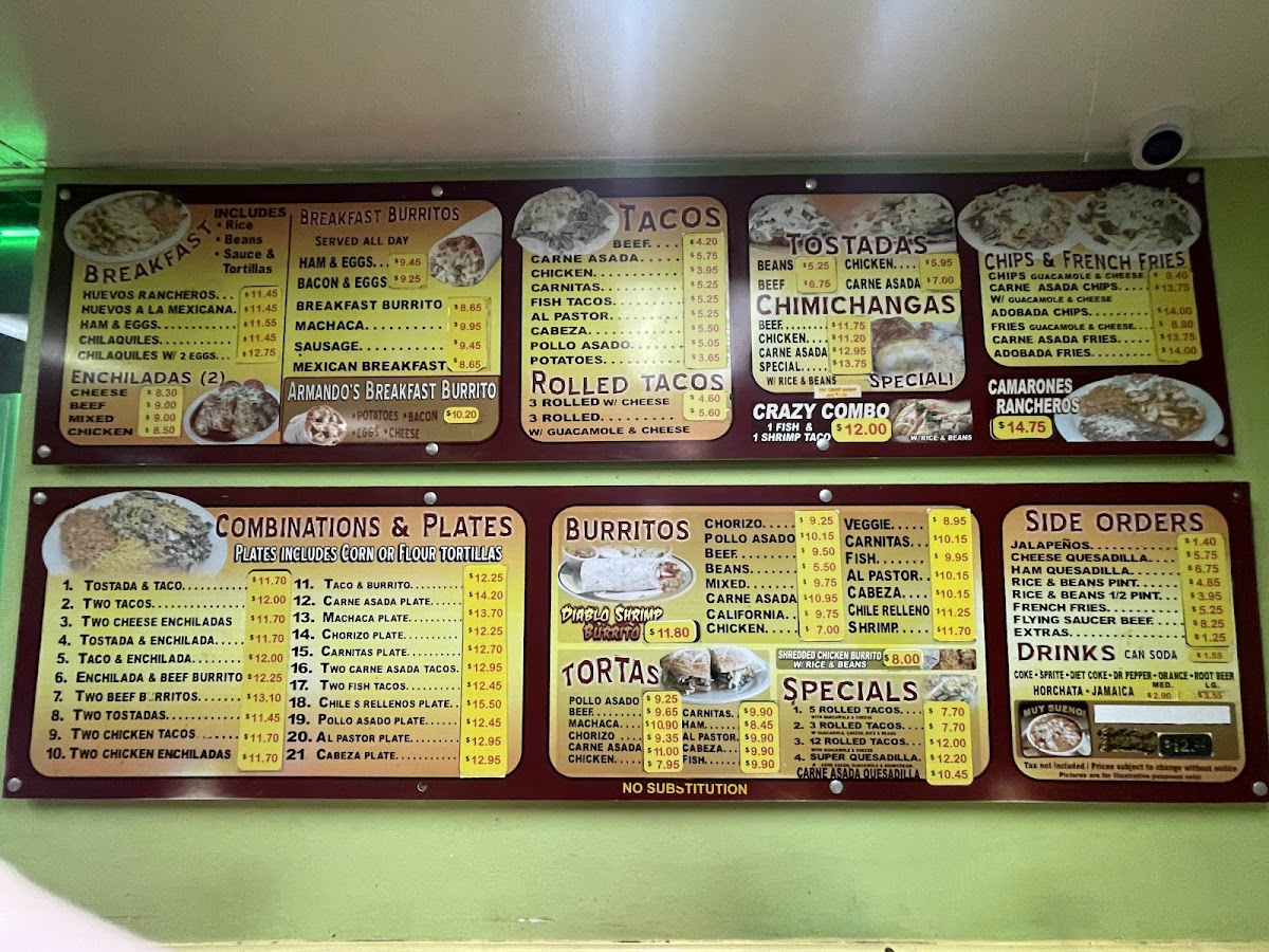 Armando's offers a tantalizing selection of dishes that truly highlight the richness of Mexican flavors. The menu features mouth-watering breakfast burritos, including must-tries like the Ham & Eggs and the famous Machaca, which packs a hearty punch of flavor for just $9.95. For lunch or a late-night snack, their burritos come in various tantalizing options, including Chorizo, Pollo Asado, and Carnitas, all perfectly wrapped for a satisfying meal. At prices starting as low as $5.50 for the Bean burrito, you can indulge in hearty portions without breaking the bank.